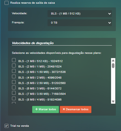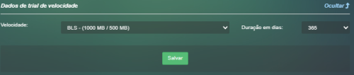 Estando com a flag marcada no plano, ao criar um novo contrato será exibido uma nova seção Dados de trial de velocidade onde estará disponível para a seleção a velocidade de degustação e o período que ficará disponível esta velocidade.
