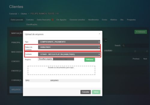 Na tela do Cliente > Dados pessoais > Arquivos, ao adicionar novos arquivos foi criada uma opção (não obrigatória) para filtrar status do contrato e contrato. Ao selecionar algum status ou contrato específico, os arquivos serão vinculados de acordo com essa seleção. Caso opte por 'Todos os status' e 'Todos os contratos' o arquivo não será vinculado a algum contrato específico.