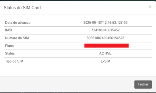 Ao clicar e "Status do SIM Card" será exibido um modal com as informações do simcard:
