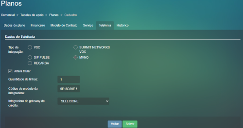 As configurações para possibilitar venda de contrato com tecnologia móvel MVNO integrados a plataforma DATORA se iniciam no cadastro do plano. Ao cadastrar um plano com “TECNOLOGIA MOVEL” na aba “Telefonia” do plano estará disponível para a seleção o “Tipo de integração ” e este deverá esta marcado MVNO, com a opção marcada, será habilitado os campos “Quantidade de linha” onde será informado o número de linhas máximo que o plano suporta e o “Código de produto Integradora” (referenciando o iD do produto na plataforma).