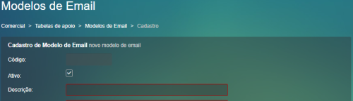 Ao selecionar um modelo de e-mail serão carregados todos os modelo que estiverem marcados "Ativo", que não sejam "E-mail de cobrança" e sejam do tipo de envio "CADASTRO_CLIENTE".