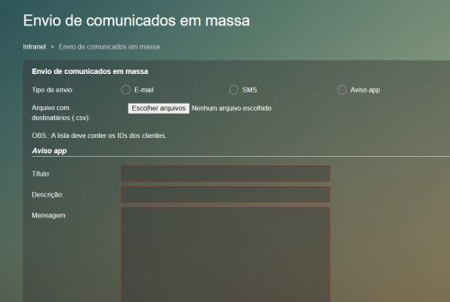 Tela para configurar envios de comunicados em massa (oção 'Aviso app')