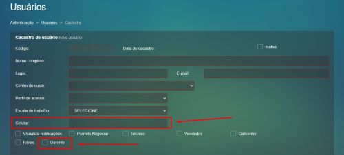 Na tela de cadastro do usuário será possível informar se esse usuário é gerente e também o celular do usuário.