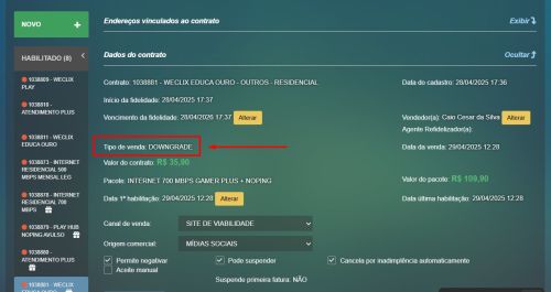 Alterada regra para setar o campo TipoVenda nos contratos originados de alteração de paocte. Caso o novo pacote tenho um valor menor que o anterior, será preenchido DONWGRADE. Se o novo pacote tiver um valor maior, será preenchido como UPGRADE.