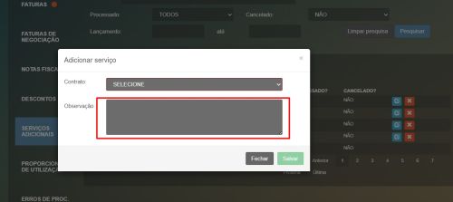 Implementada limitação de caracteres (256) na tela do cliente > dados financeiros > aba serviços adicionais > campo 'Observação'.